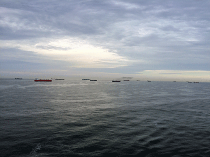 Ca. 15 Frachtschiffe auf dem Weg nach Rotterdam.
