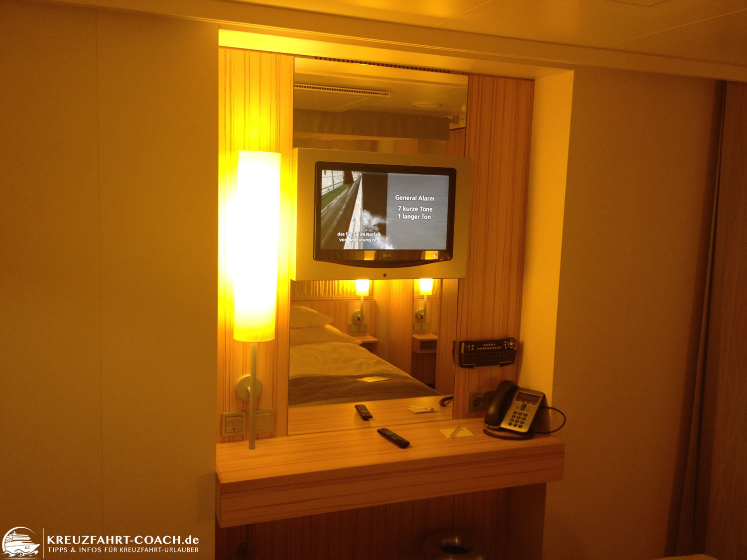Apropos Sichtschutz: Den braucht man bei diesen Kabinen auch! Es gibt immer mal wieder Arbeiten, bei denen Crewmitglieder bei den Rettungsbooten „rumklettern“ müssen. Direkt vor unserer Kabine war eine Art Wartungsgang, auf denen hin und wieder Crewmitglieder herumliefen. Es kommt auch schon mal der Fensterputzer zu Besuch… ;-) Die sind zwar wie immer nett und freundlich und keiner glotzt direkt in die Kabine rein (haben wir zumindest noch nie erlebt) – aber wenn man aus der Kabine rausschauen kann, dann kann man eben auch reingucken. Wer damit ein Problem hat, der sollte so eine Kabine besser nicht buchen. Man kann den Vorhang zwar zulassen, aber war’s das auch mit dem Meerblick. Dann ist man mit einer Innenkabine besser bedient.