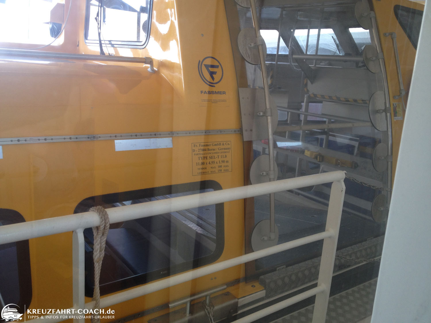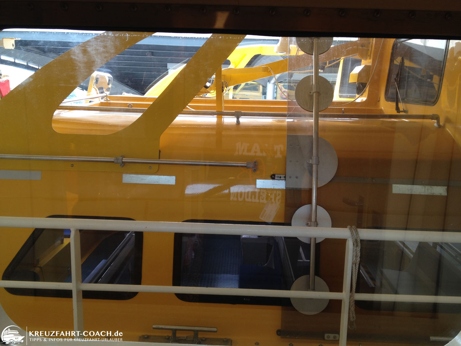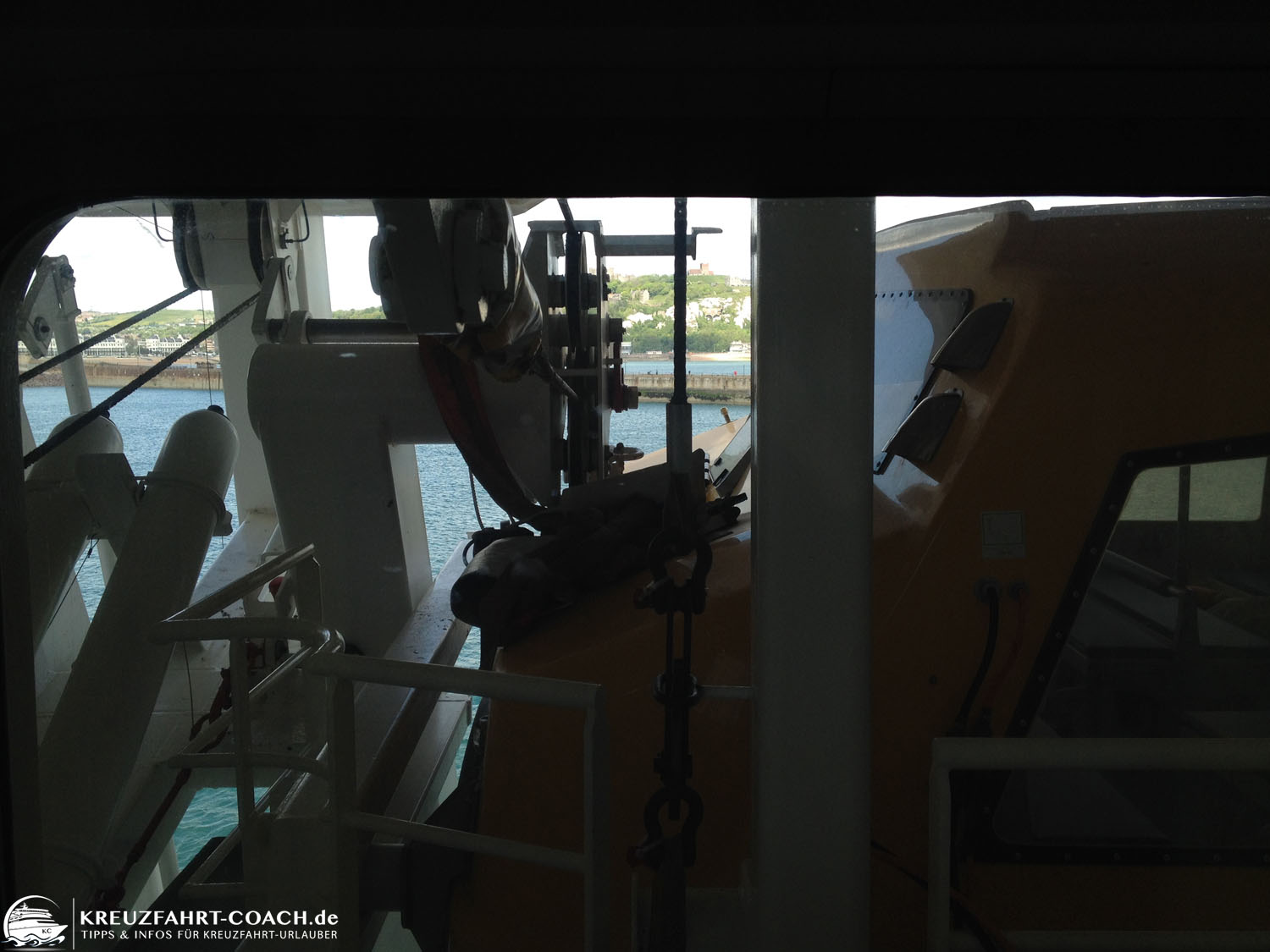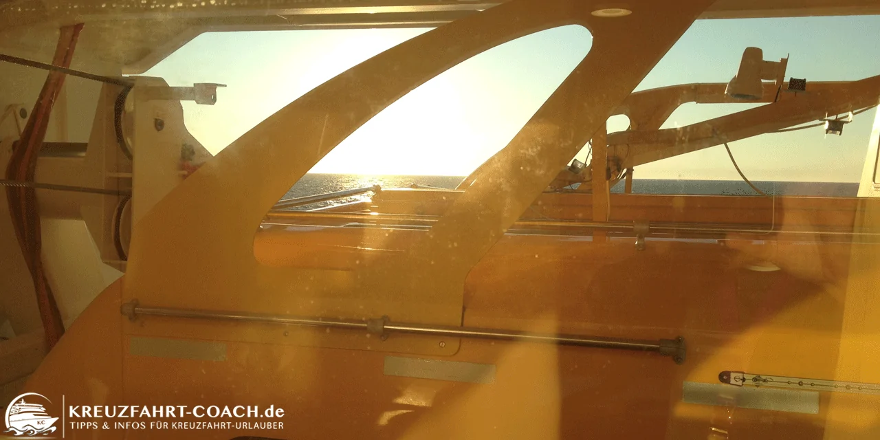 Eine Meerblickkabine mit eingeschränkter Sicht hat zwar ein Fenster (kann man nicht öffnen), allerdings ist das Blickfeld mehr oder weniger versperrt. In unserem Fall hatten wir eine der Kabinen, die sich hinter den Rettungsbooten befinden. Wie man auf den Bildern unten sehen kann, wird ein großer Teil des Sichtfeldes durch das Rettungsboot verdeckt.