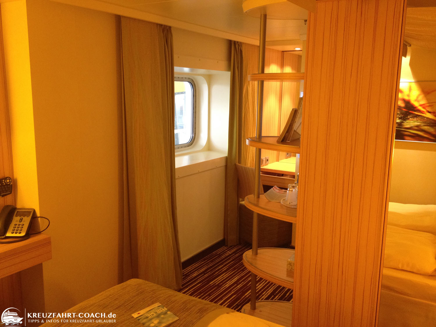Meerblickkabinen sind etwas größer als die Innenkabinen. Die Raumaufteilung hat uns allerdings nicht so gut gefallen. Wenn man hereinkommt, war links um die Ecke das Bett (Bilder siehe unten). Vor allem der Durchgang neben dem Bett an der Außenwand ist sehr schmal. In den Innenkabinen konnte ich da bisher immer gut meinen Koffer unterbringen. Das war hier nicht möglich. Aber das dürfte für die meisten wohl kein Thema sein.