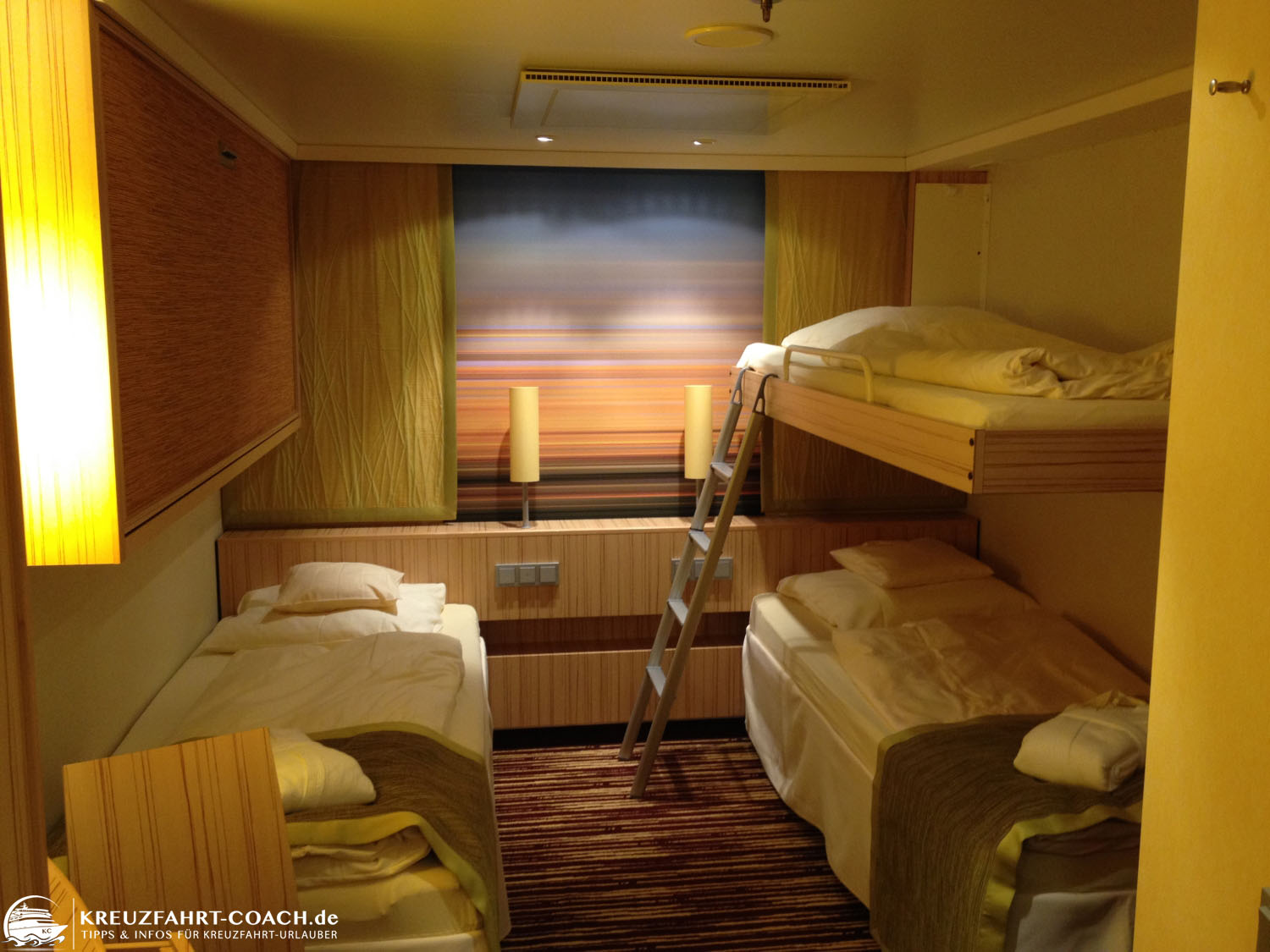 Die 4-Bett-Kabinen mit Pullman-Betten werden gerne von Familien mit Kindern gebucht und sind auch für die gemeinsame Fahrt mit einer Clique geeignet. Viel Platz hat man zwar nicht – aber in den Innenkabinen hält man sich ja sowieso fast nur zum Schlafen auf.
