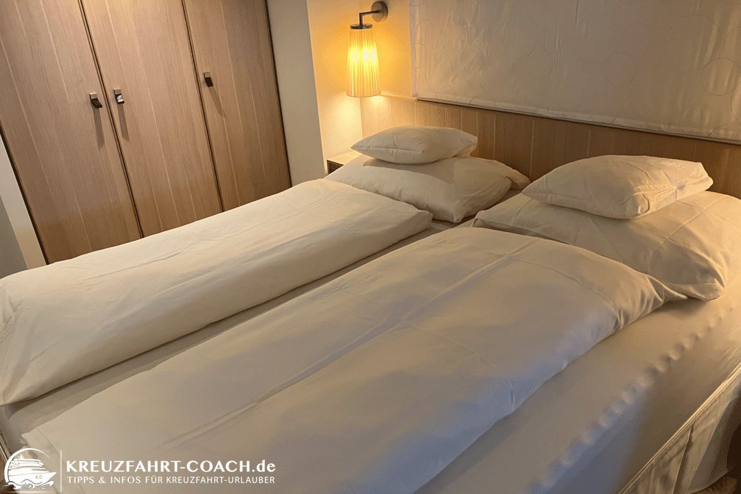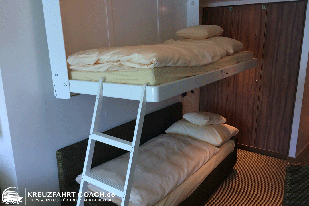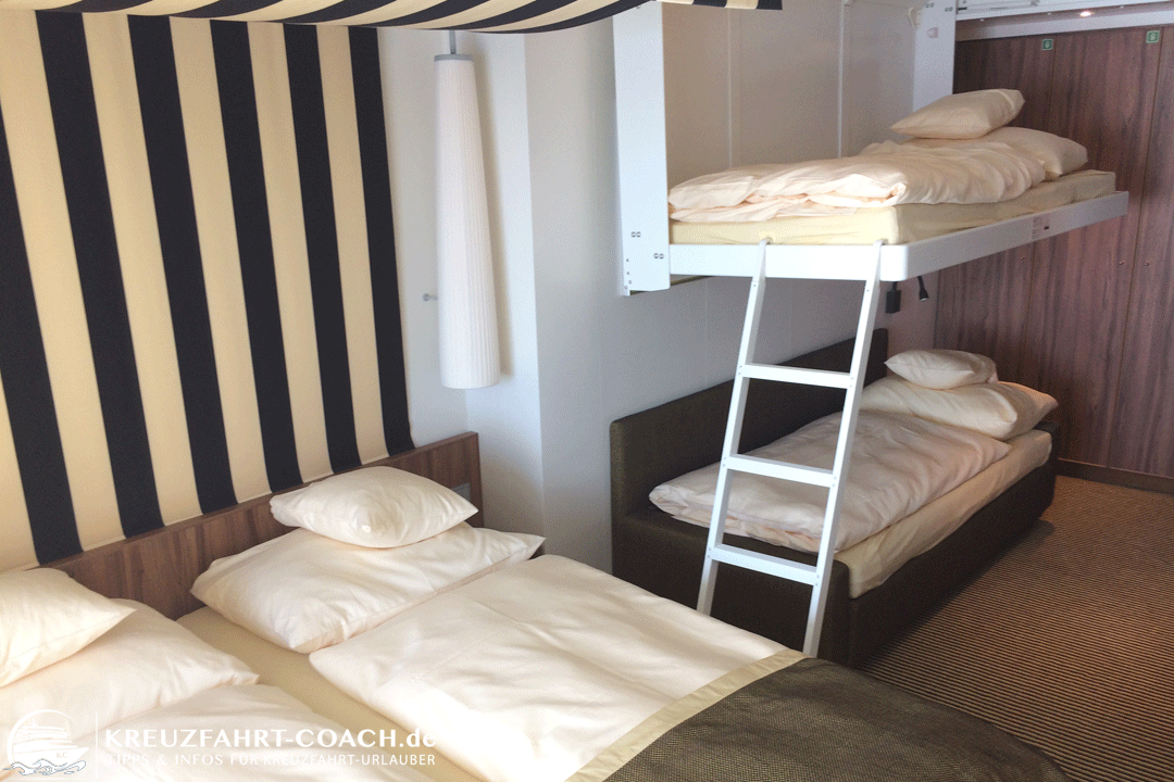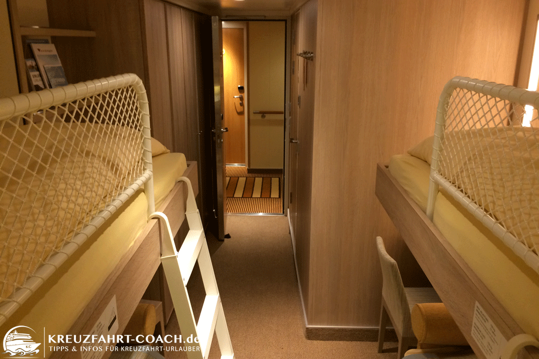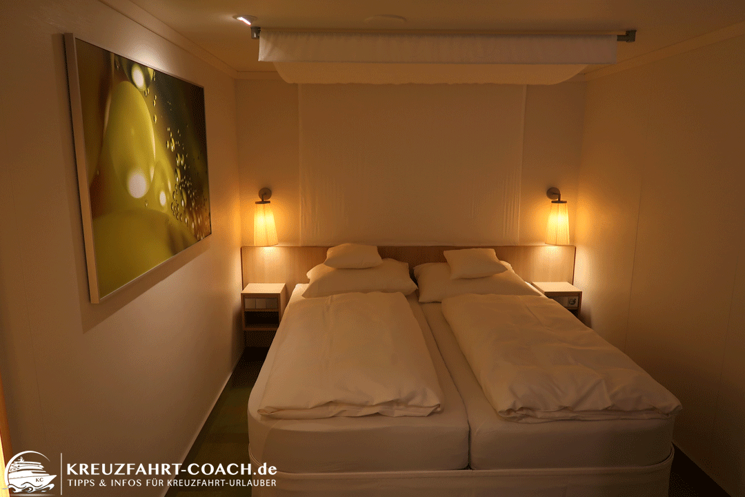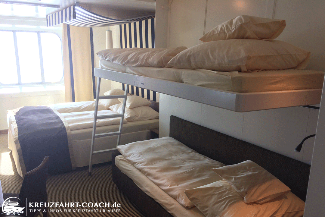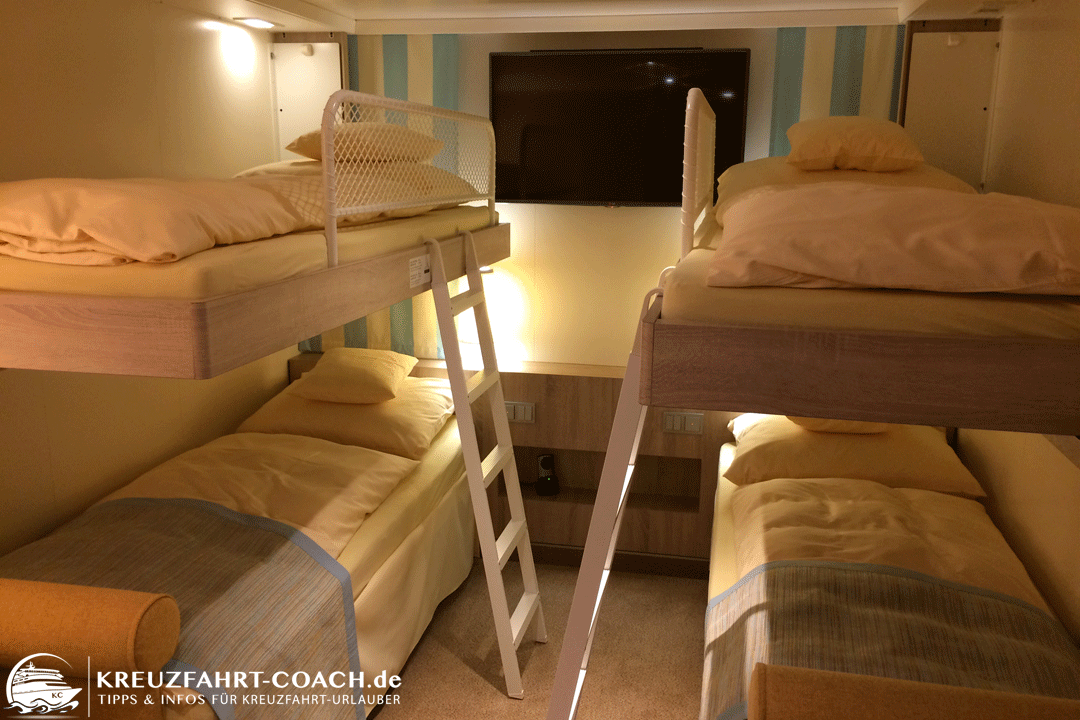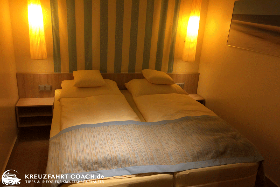Innenkabinen gibt es für zwei bis vier Personen. In den Kabinen für bis zu vier Gäste stehen die Betten getrennt, wie Du auf den Bildern unten sehen kannst: