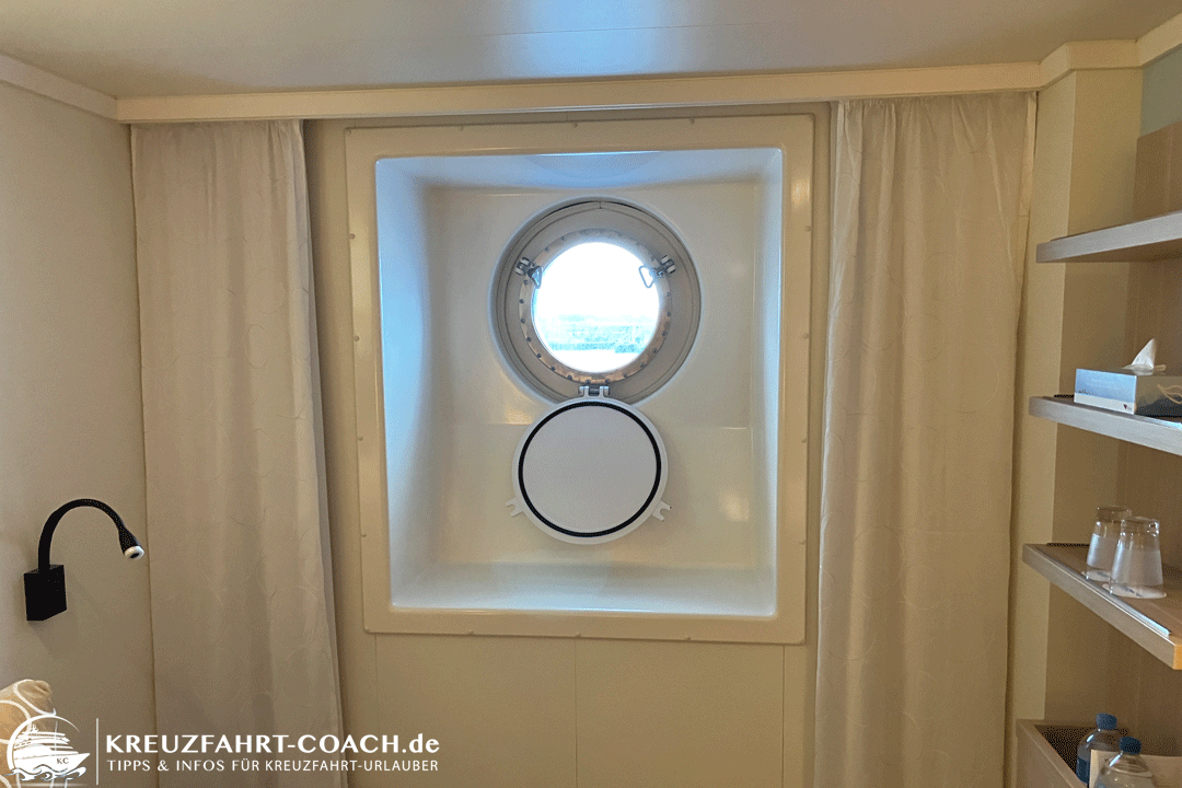 Bis vor kurzem wusste ich gar nicht, dass es sowas überhaupt noch gibt: Kabinen mit Bullaugen, statt der normalen Panorama Fenster. Diese Bilder stammen aus der Kabine 4093 (Meerblickkabine – Standard mit 2 Betten) auf AIDAnova: