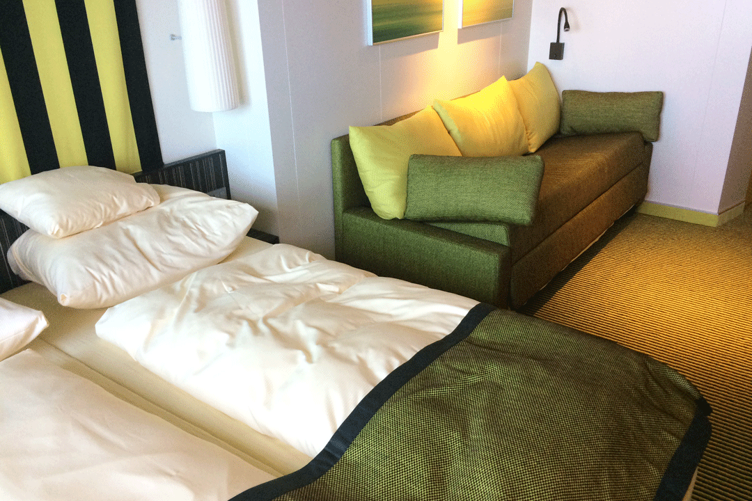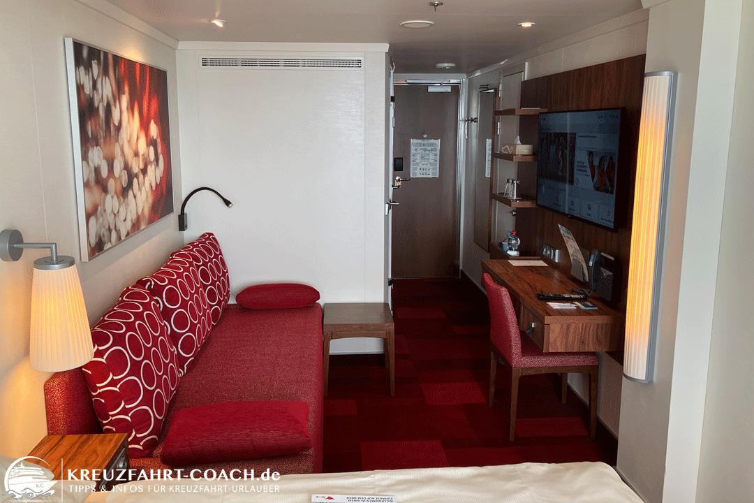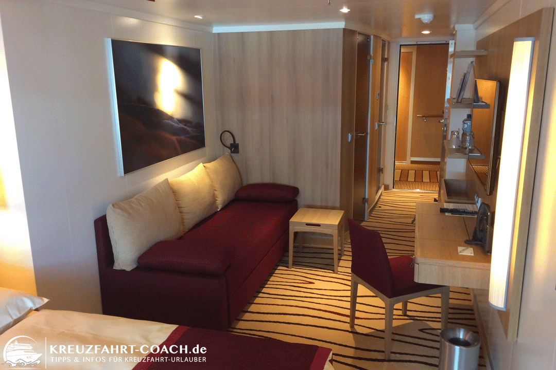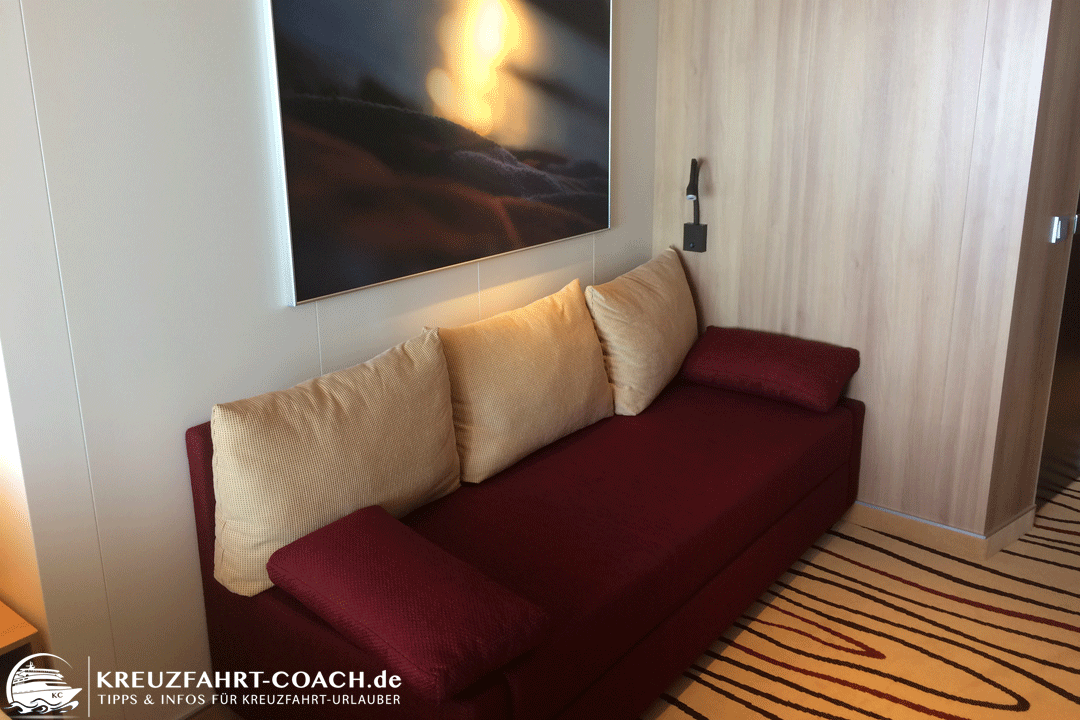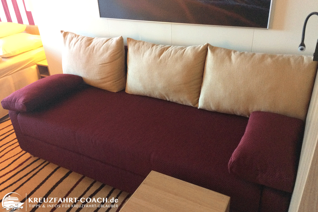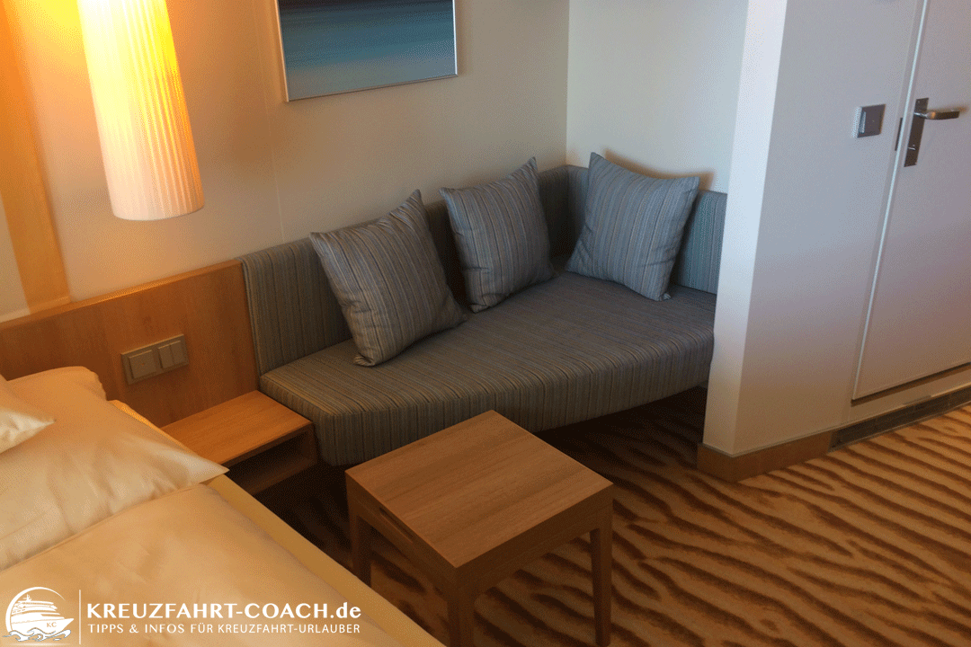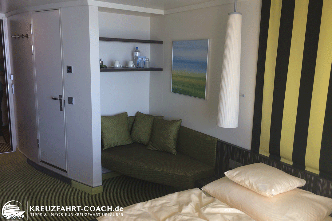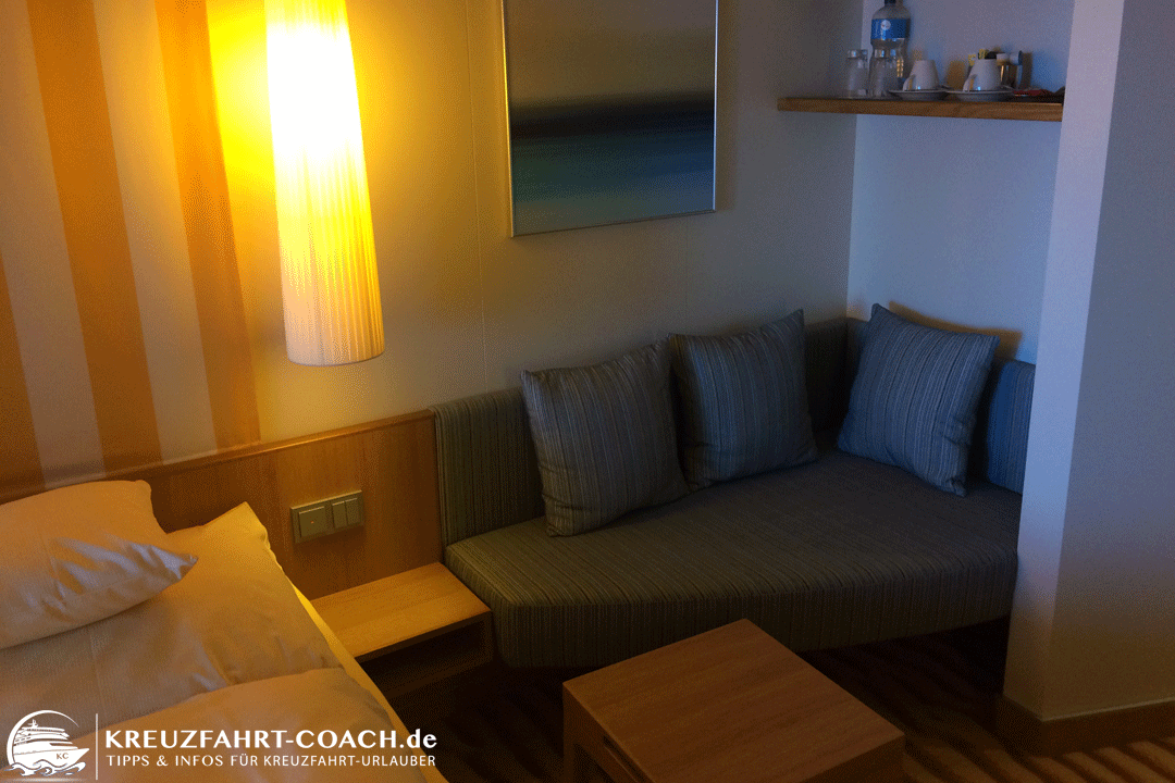 So sieht die Kabine für die Belegung mit zwei Gästen aus. Aus dem Sofa kann man einen weiteren Schlafplatz machen, siehe Kabine 4133.