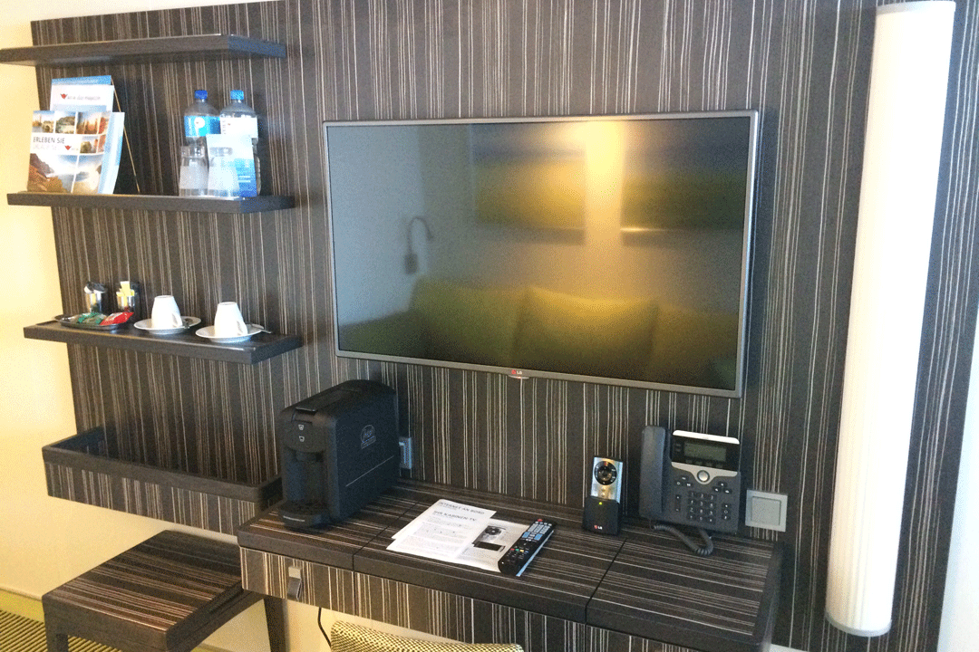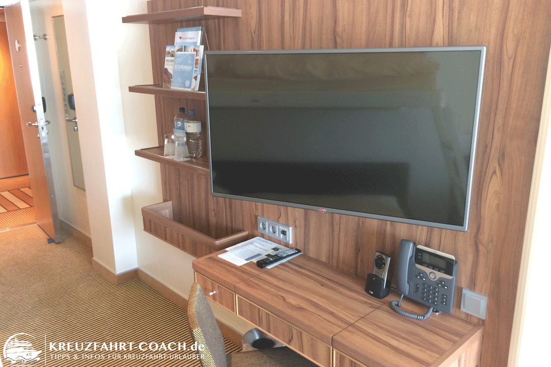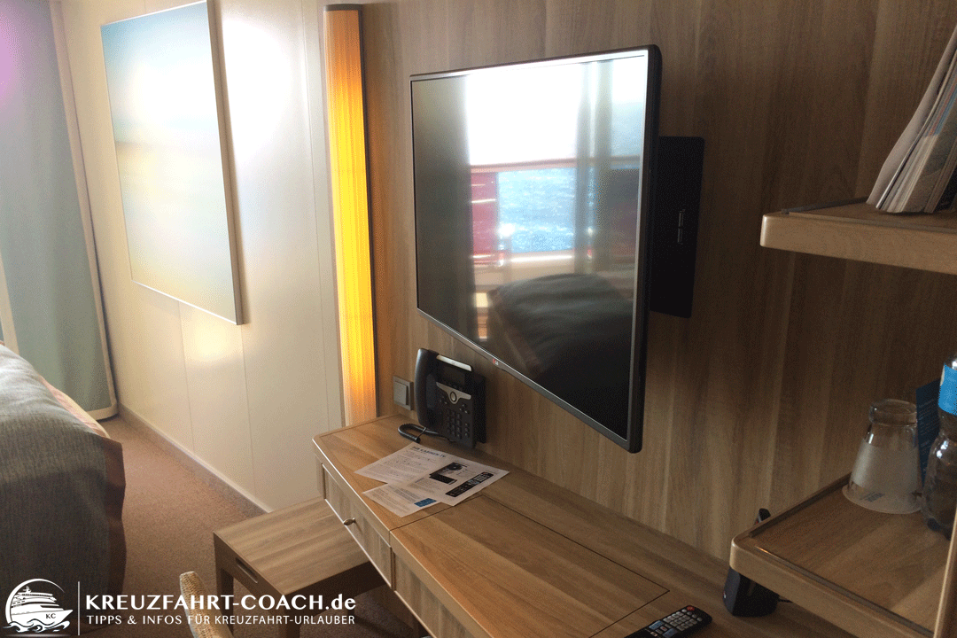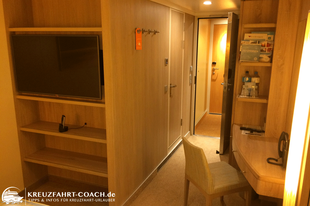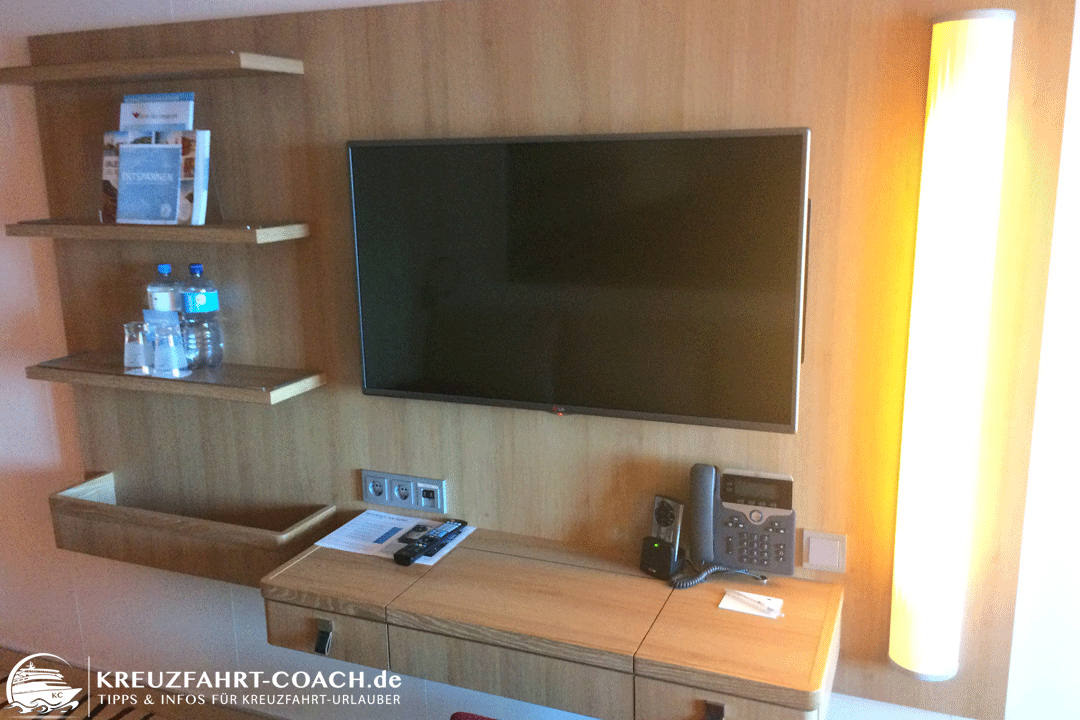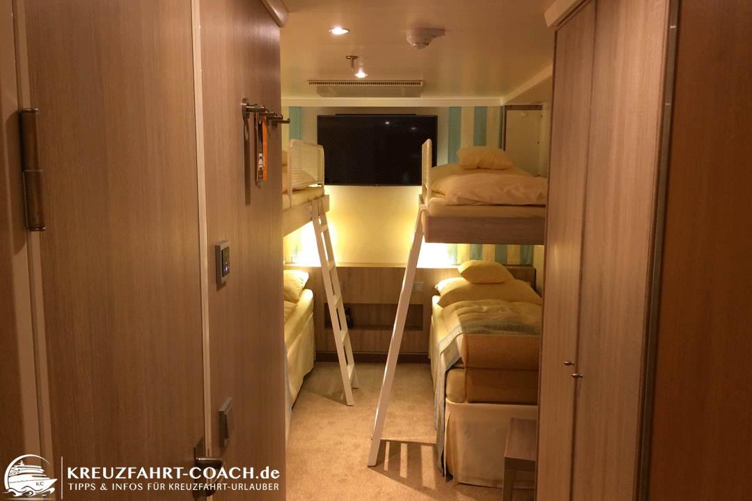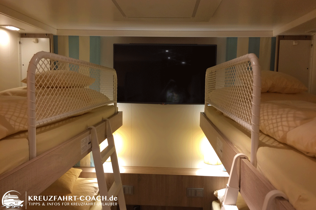 Wenn man mit drei oder vier Personen in einer Innenkabine übernachten möchte, stehen die Betten getrennt. Die Pullmanbetten können bei Bedarf runtergeklappt werden. Wir hatten so eine Kabine schon mal im VARIO zugeteilt bekommen. Für zwei Personen nicht so toll, finde ich. Den Fernseher hat man außerdem im Rücken: