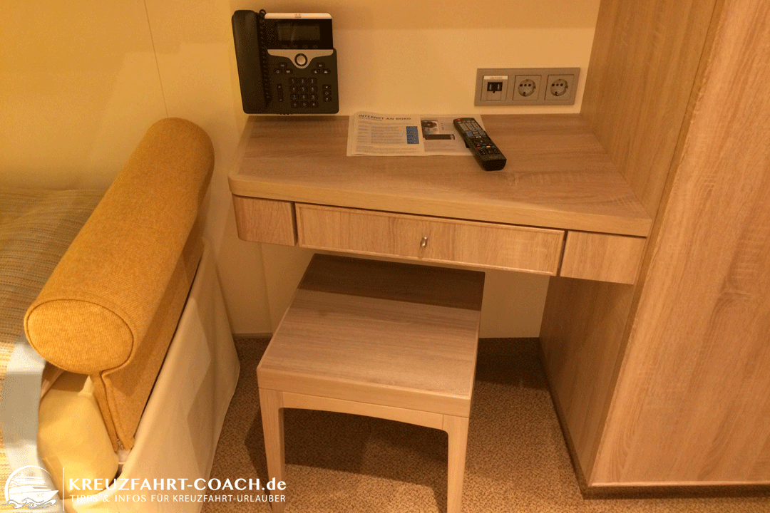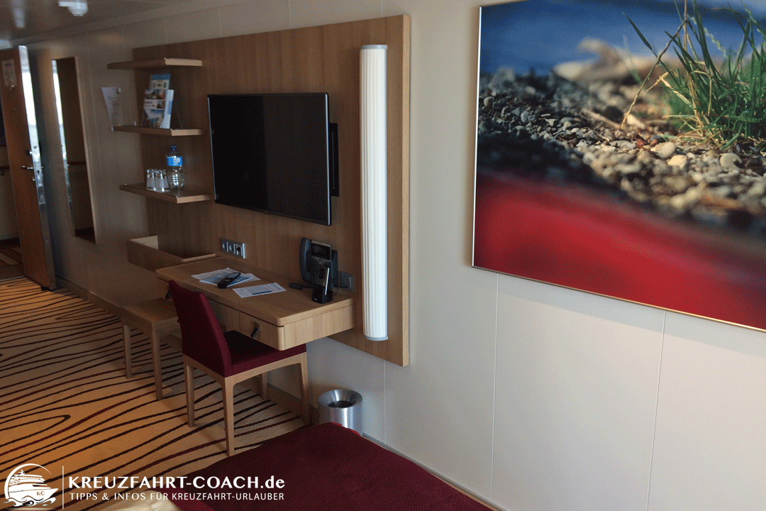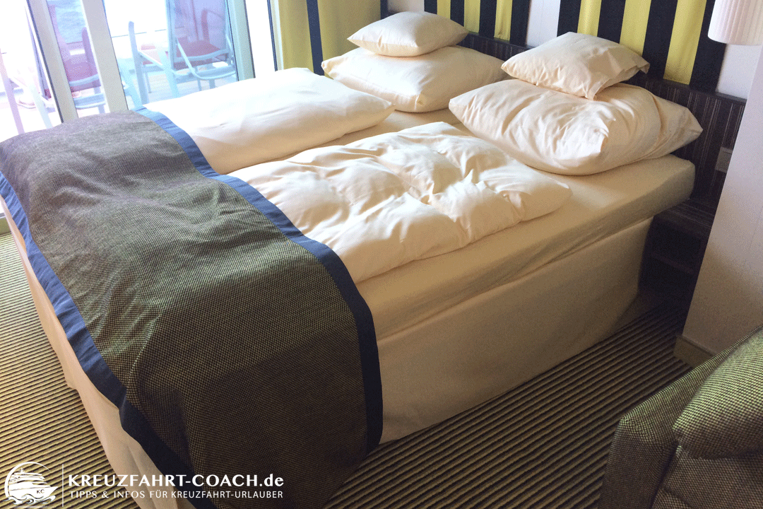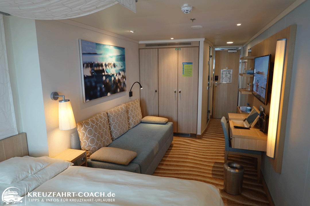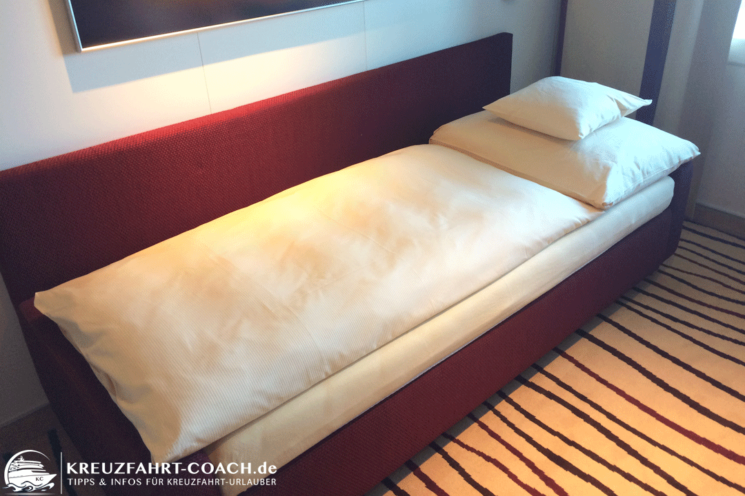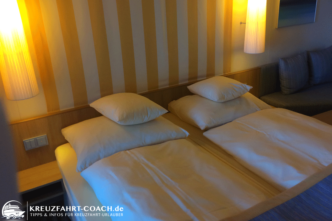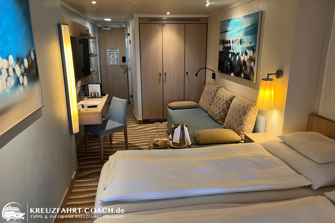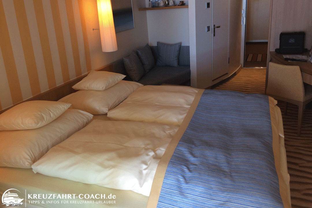 Die Kabine 9277 kann mit bis zu drei Gästen belegt werden. Neben dem Doppelbett gibt es eine Schlafcouch. Auf den Bildern ist die Kabine für zwei Gäste vorbereitet: