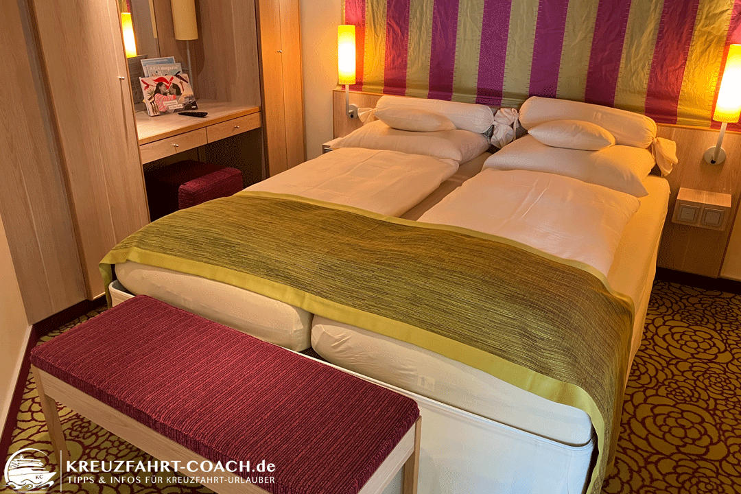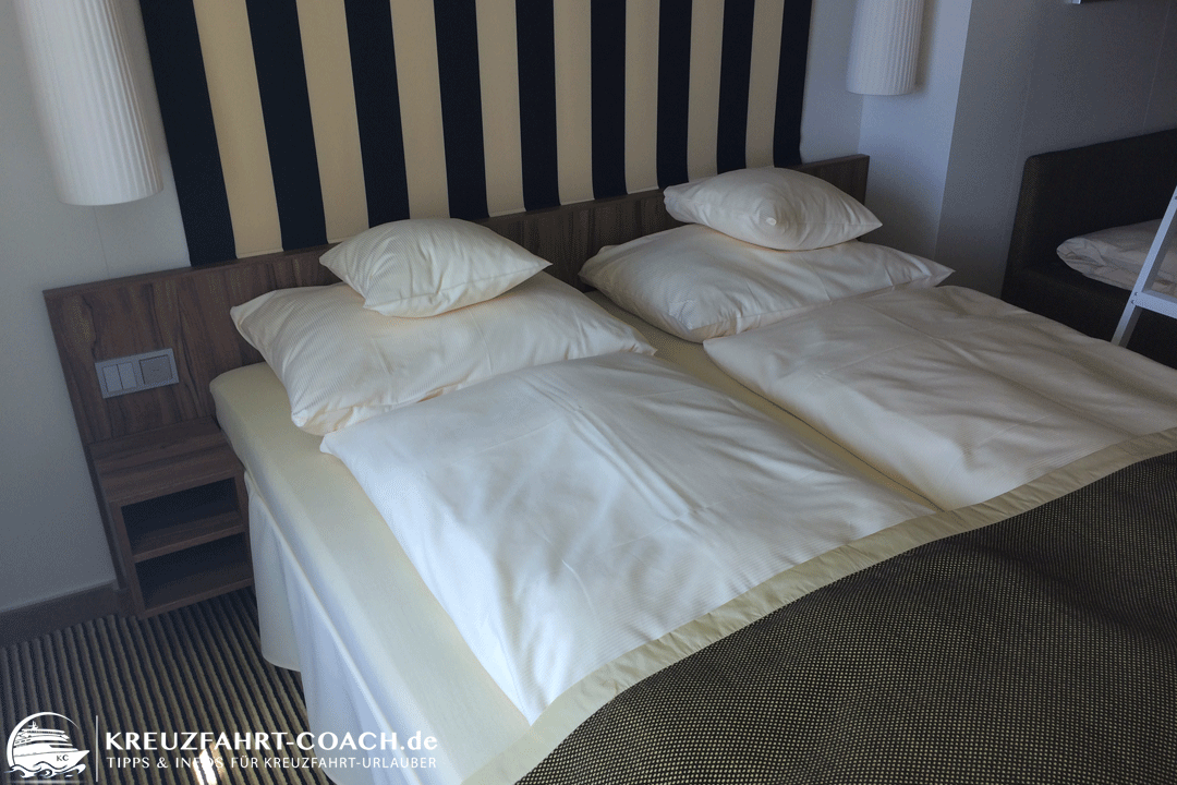 Die Kabine 4228 auf den Bildern ist für 4 Personen eingerichtet. Neben dem Doppelbett gibt es eine Schlafcouch und ein Pullmanbett: