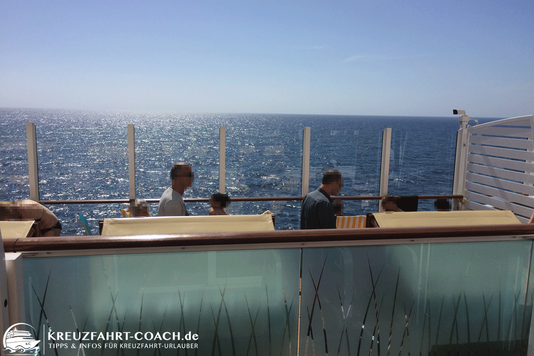 Diese Kabinen auf Deck 8 von AIDAperla haben einen entscheidenen Nachteil: Weil sie direkt am Außendeck liegen, können andere Gäste hineinschauen. Aus diesem Grund werden diese Kabinen auch als „Spannerkabinen“ bezeichnet. Schön ist hingegen der Wintergarten: