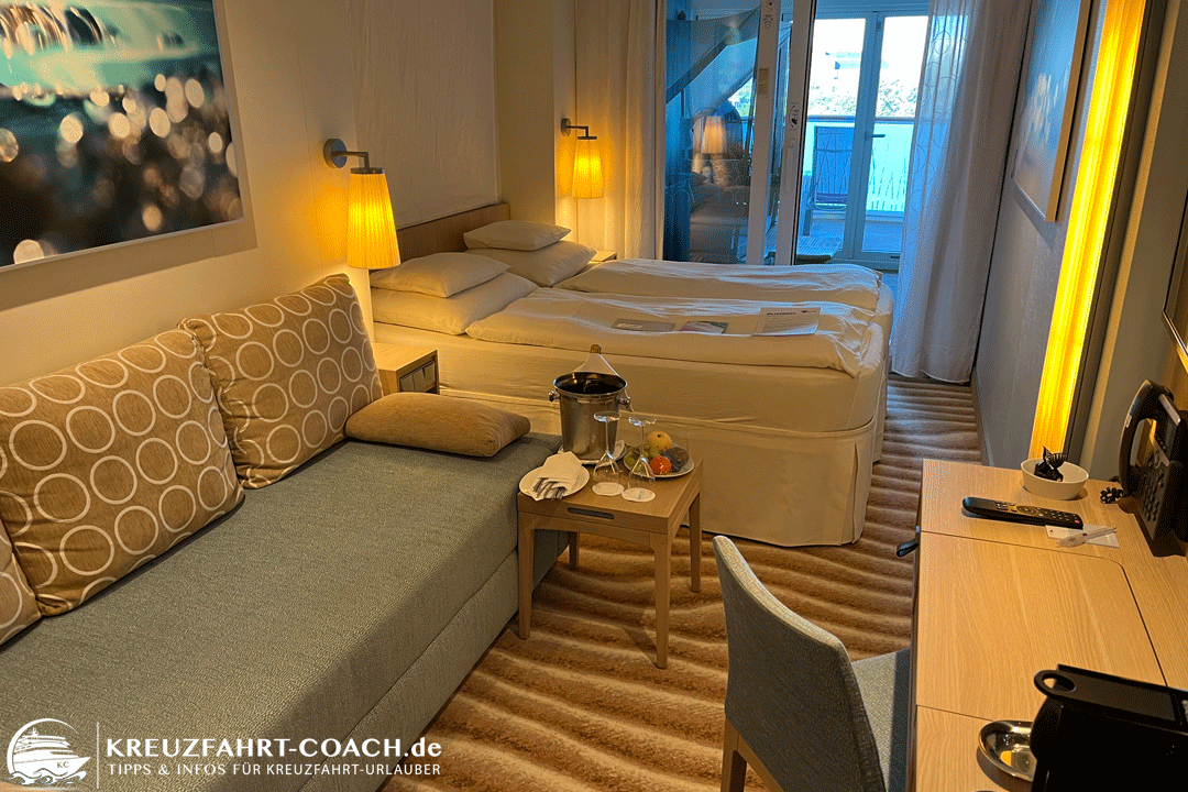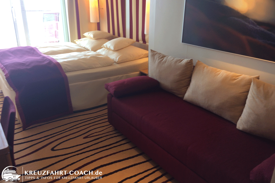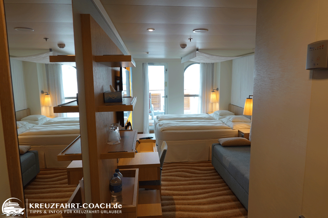 Wenn Du Dich fragst, wie man mit vier Personen in einer Balkonkabine wohnt, dann vermitteln Dir diese Bilder einen Eindruck. Neben dem normalen Doppelbett wird das Sofa zum Schlafplatz und ein Pullman-Bett wird ausgeklappt. Beispiel Kabine 9066 (Balkonkabine – Standard mit 4 Betten) auf AIDAnova: