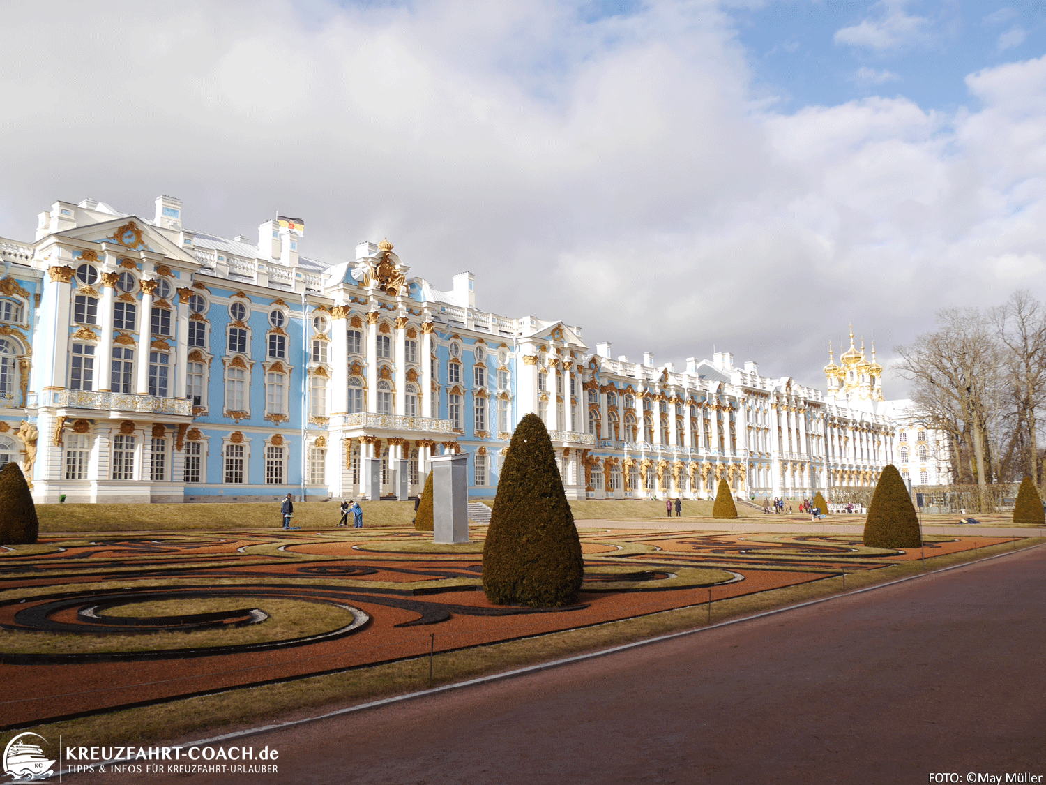Wer etwas mehr Zeit hat oder seine Kreuzfahrt in St Petersburg beginnt und vorher dort ist, sollte sich auch die Umgebung anschauen. Der Palast Peterhof im Westen (Minibus ab Metro Avtovo) und der Katharinenpalast (Minibus ab Metro Kupchino oder Moskovskaya) mit dem nachgebauten Bernsteinzimmer und fantastischen Gärten sind beide einen Besuch wert. In beiden Palästen werden deutschsprachige Audio-Guides angeboten.